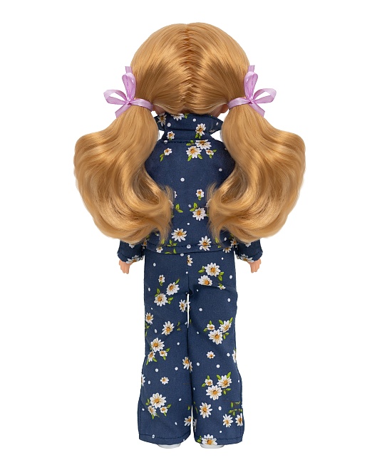 Образ Софии кэжуал 4 включает в себя: джинсовый костюм с принтом «ромашка», розовую футболку, нижнее бельё, банты для волос и обувь.