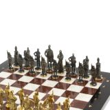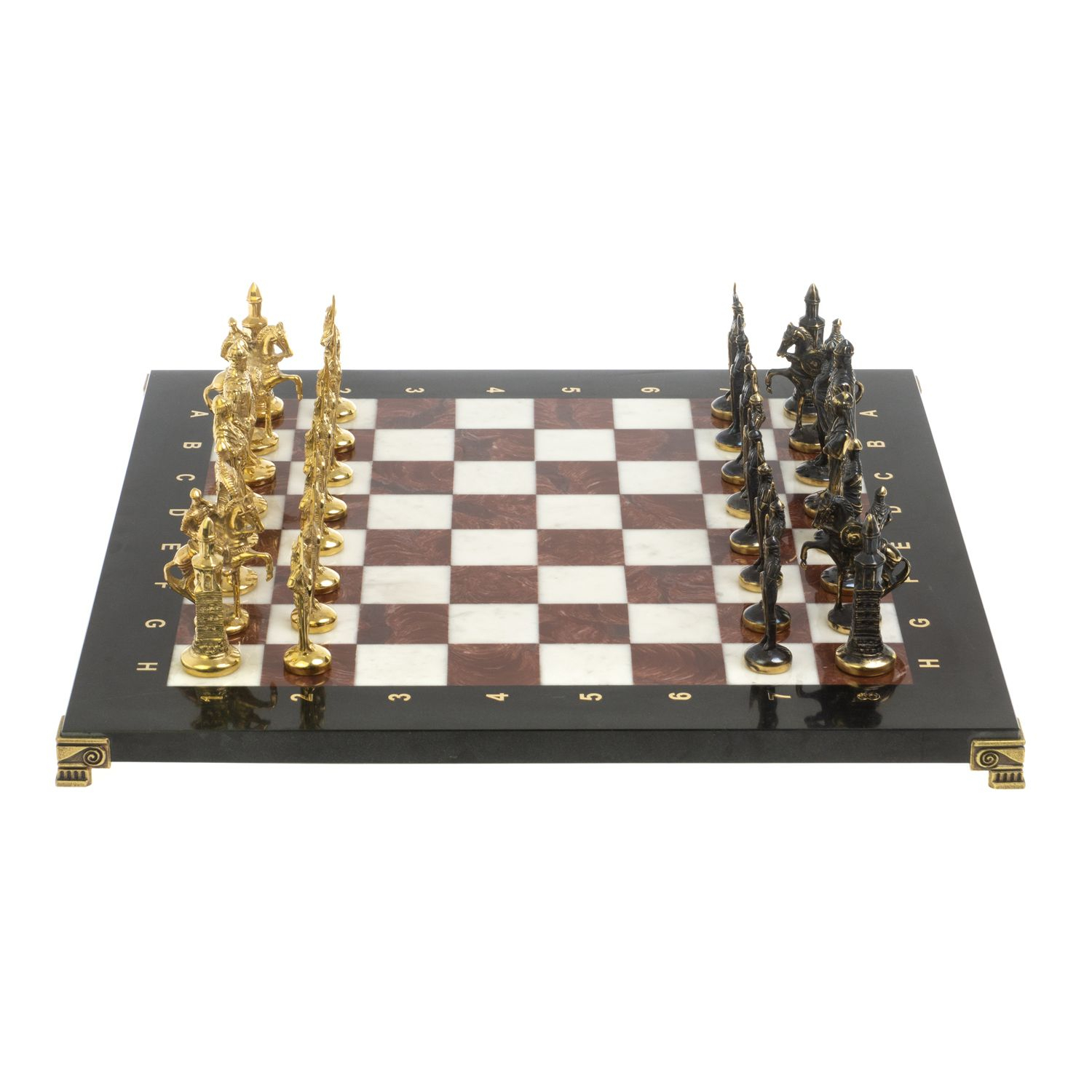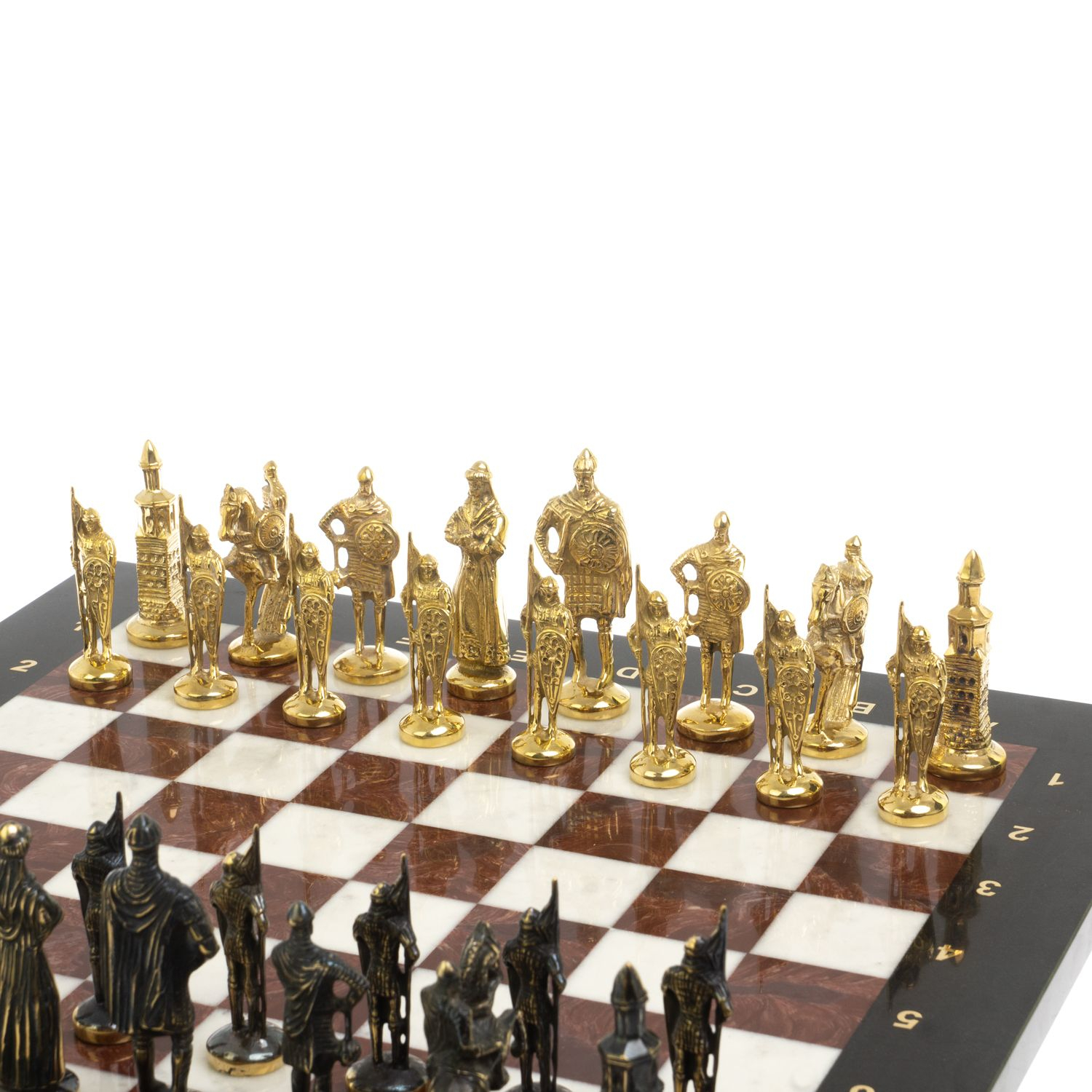 Шахматная доска выполнена из мрамора и лемезита, фигуры из бронзы.